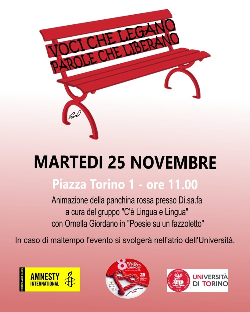 Animazione della panchina rossa con letture di testi e poesie di Ornella Giordano.Per info: ant.pie06@amnesty.it. A cura di Amnesty International – Antenna di Cuneo e DI.SA.FA. in collaborazione con gruppo di lavoro “C’è lingua e lingua”.