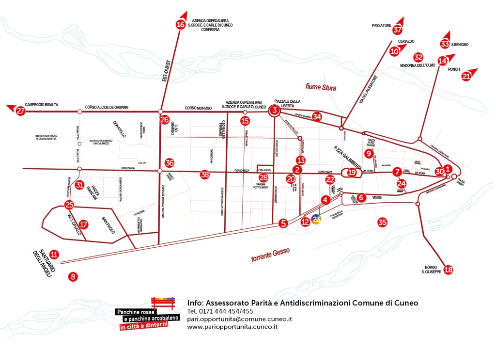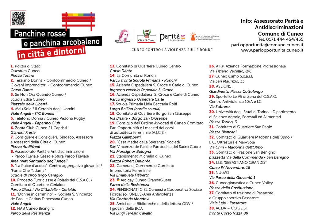 Associazioni ed enti del comune di Cuneo scelgono di adottare una panchina, impegnandosi a dipingerla di rosso e ad averne cura nel tempo, con l’obiettivo di tenere viva l’attenzione sul fenomeno dei femminicidi, inducendo le persone a fermarsi e riflettere per contrastare l’indifferenza.